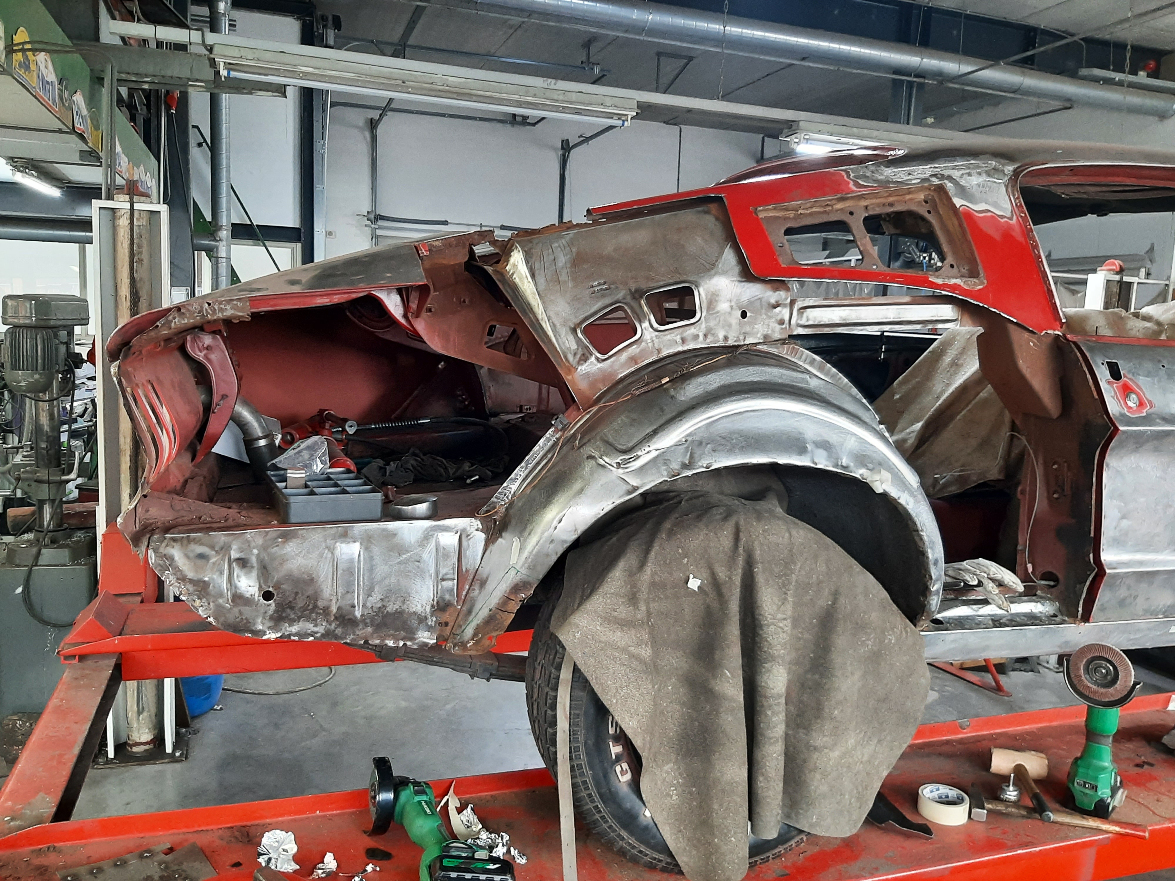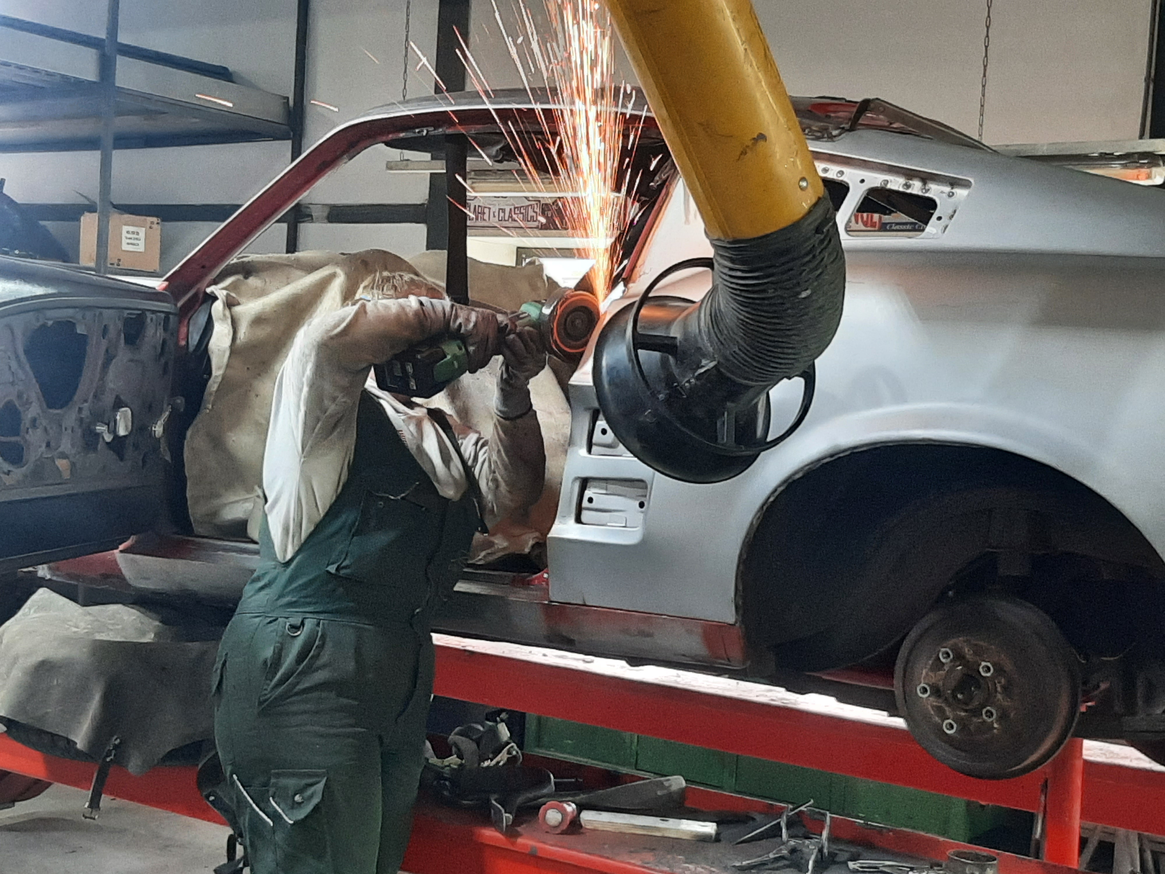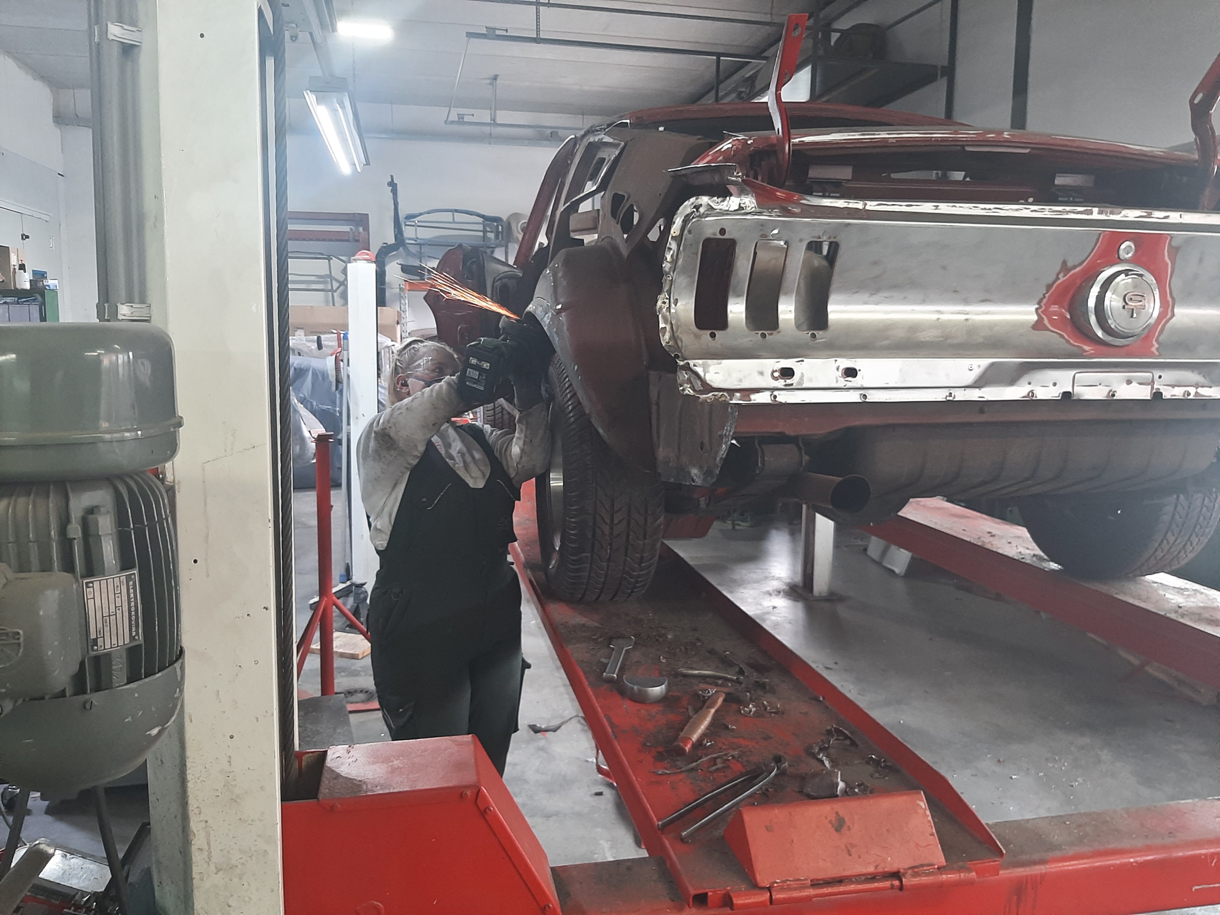 Tijdens dit project heb ik de oude achterschermen verwijderd en vervangen door nieuwe delen die ik nauwkeurig heb vastgelast. Ook de bekende kwetsbare plekken bij de wielkasten en de hoeken van de deuren heb ik aangepakt door verroeste stukken weg te slijpen en nieuwe plaatjes exact op maat in te lassen. Na dit zware plaatwerk heb ik de Mustang volledig strak gemaakt en afgewerkt in een prachtige klassiek groene kleur. De basis is technisch weer honderd procent, klaar om met een gezonde carrosserie de weg op te gaan.