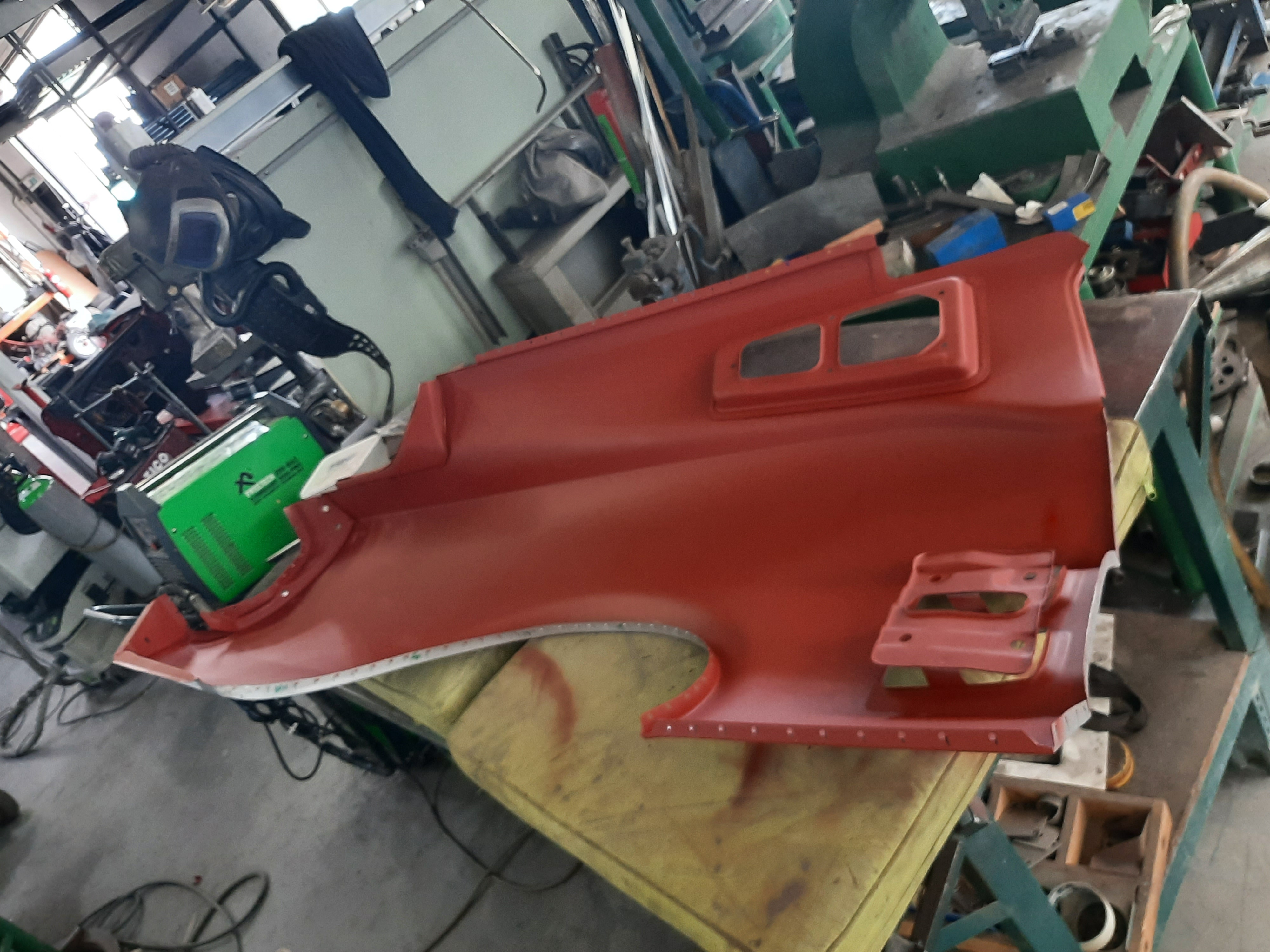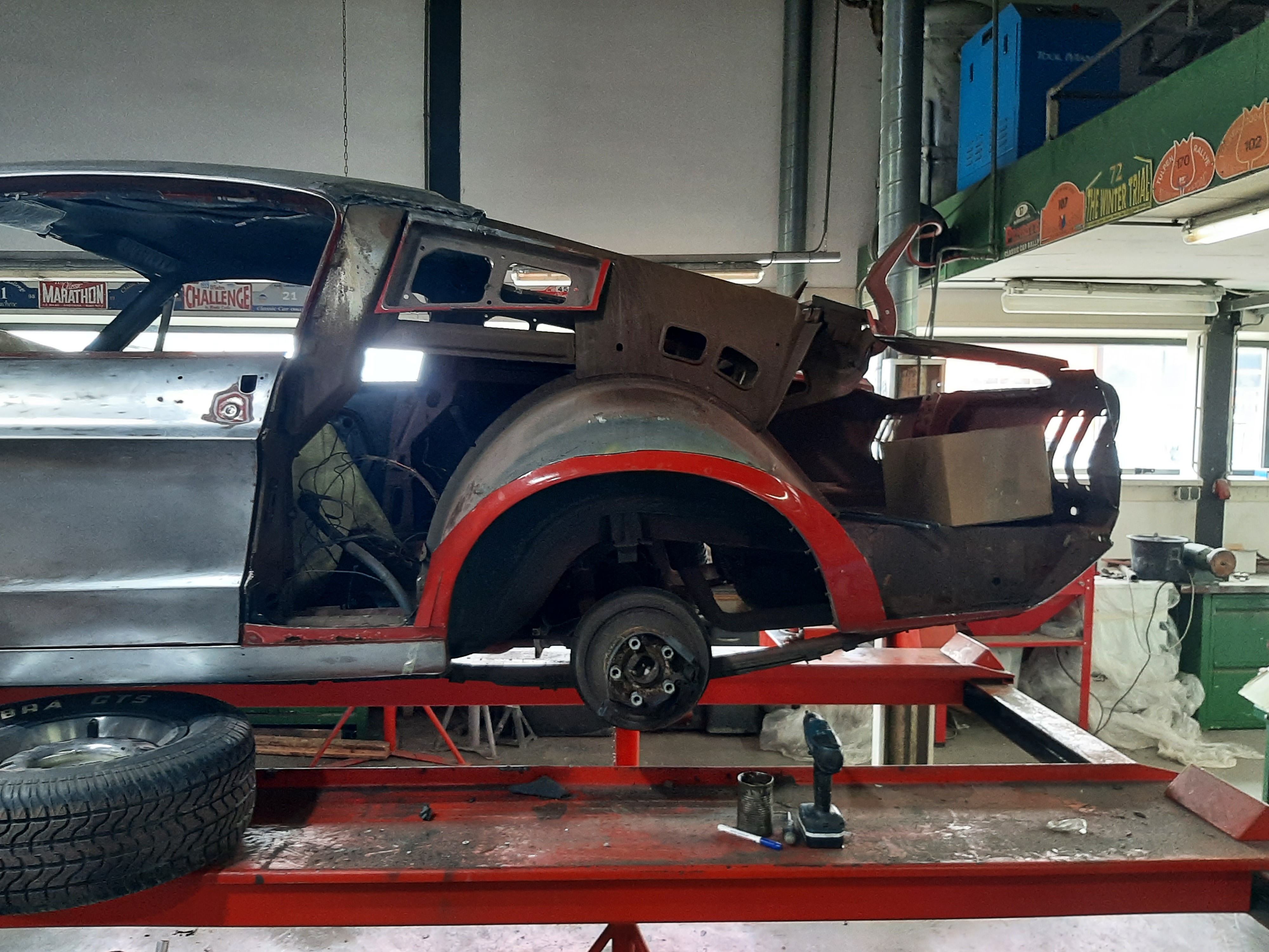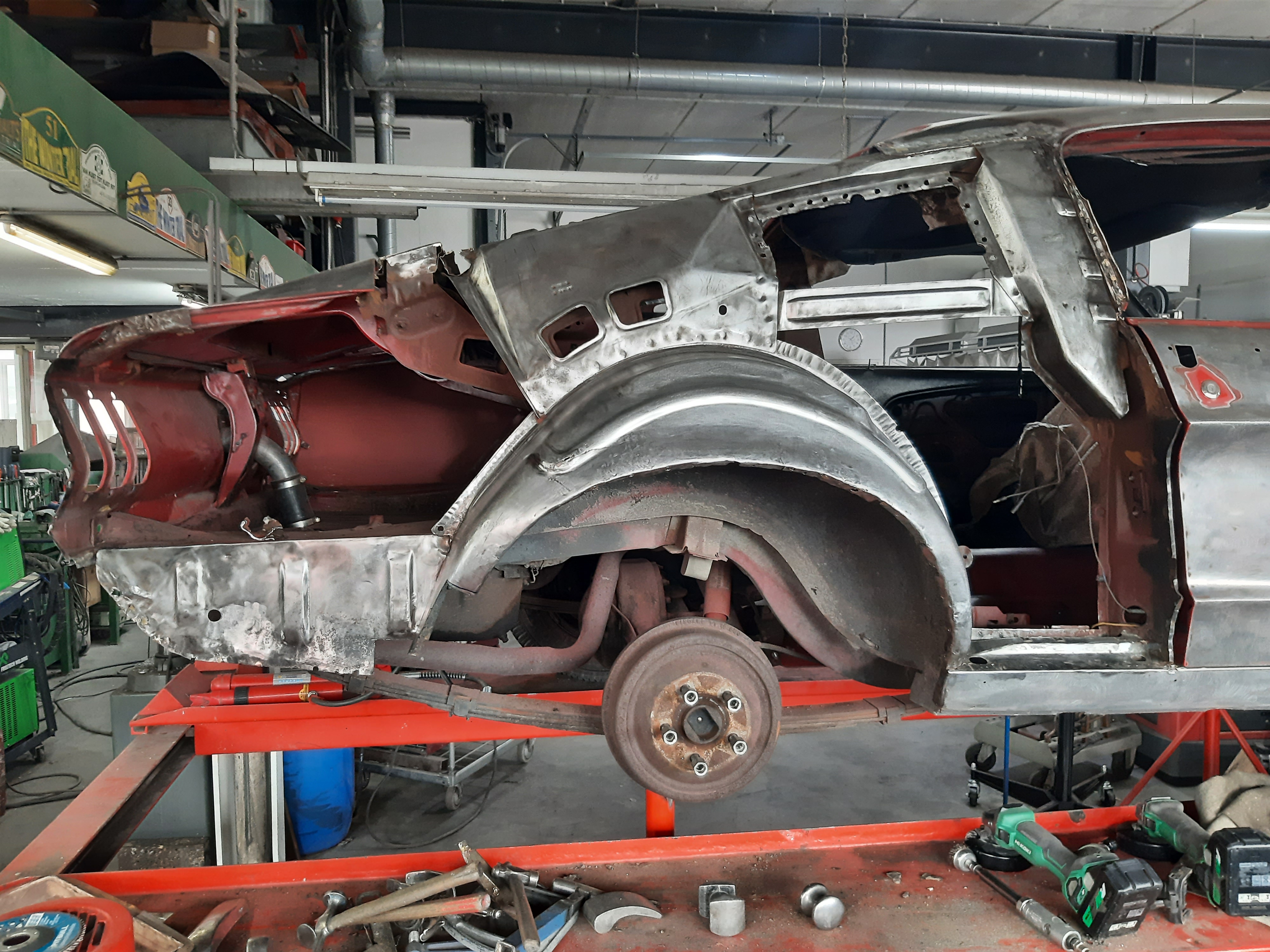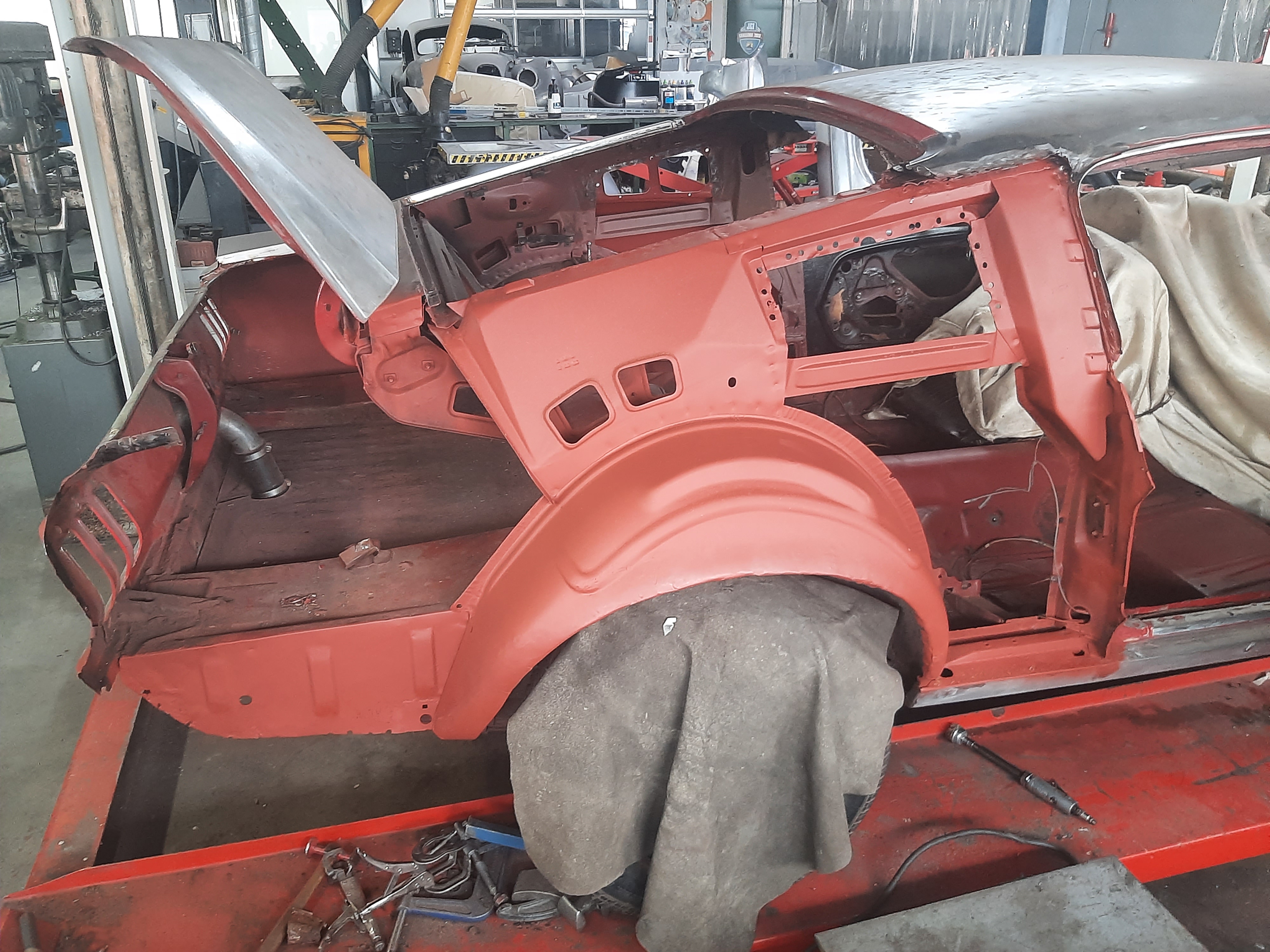 Tijdens dit restauratieproject hebben wij ons gericht op de structurele integriteit van de carrosserie. Wij hebben de originele achterschermen verwijderd en vakkundig nieuwe panelen ingelast om een perfecte pasvorm te garanderen. Ook hebben wij de bekende roestgevoelige plekken aangepakt: we hebben de aangetast delen bij de wielkasten achter en de onderste hoeken van beide deuren weggeslepen. Voor deze secties hebben wij handmatig nieuwe plaatdelen op maat gemaakt die exact aansluiten op de originele contouren.