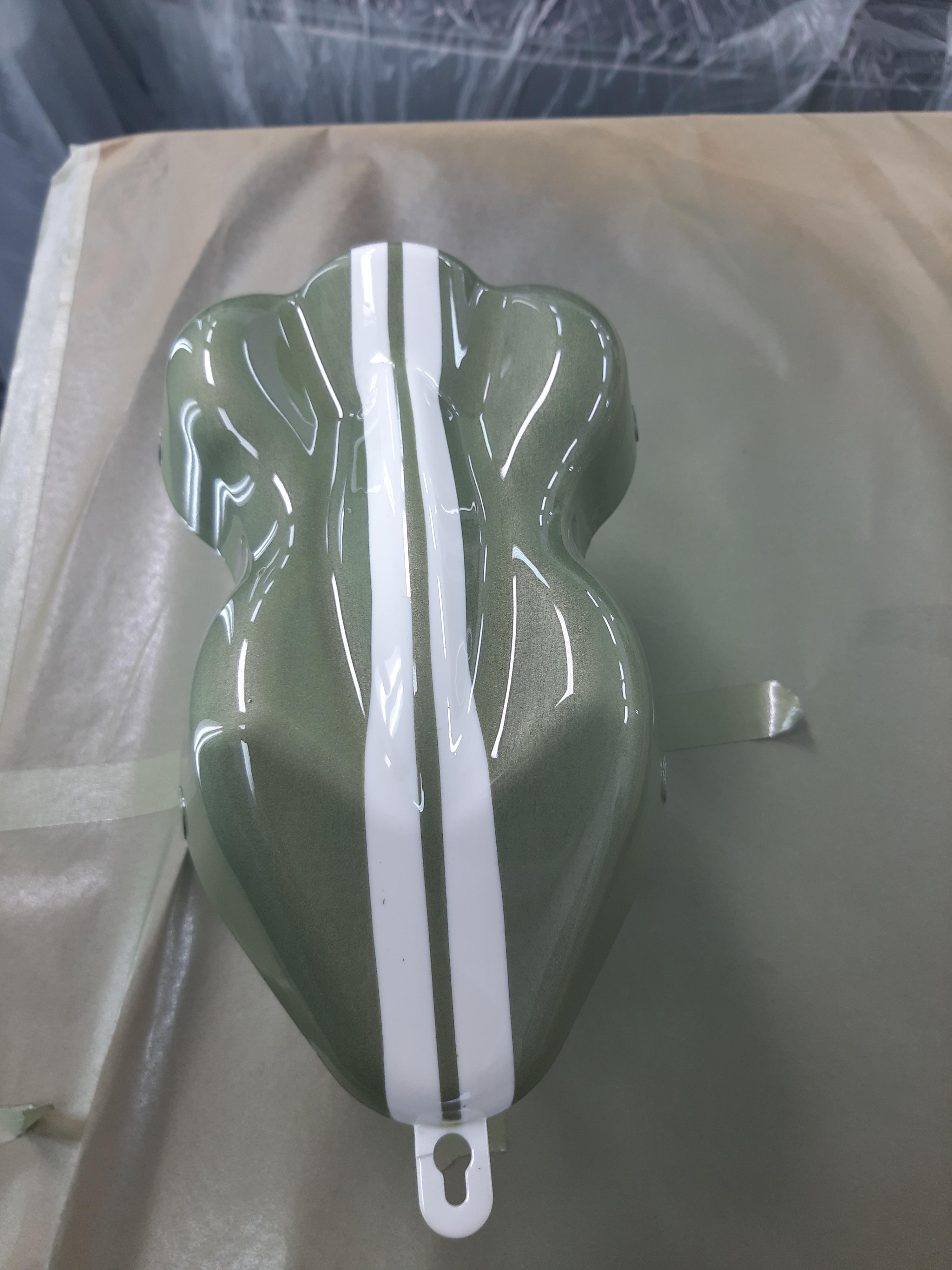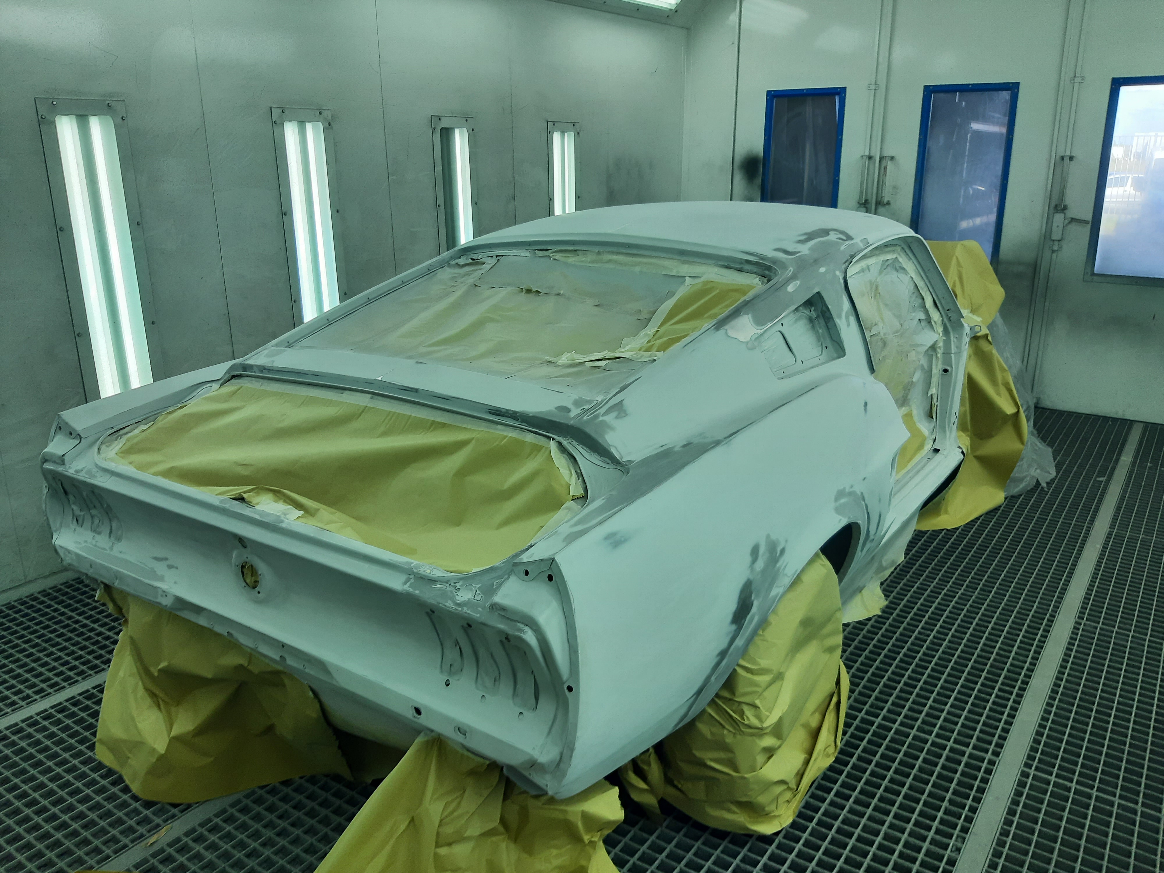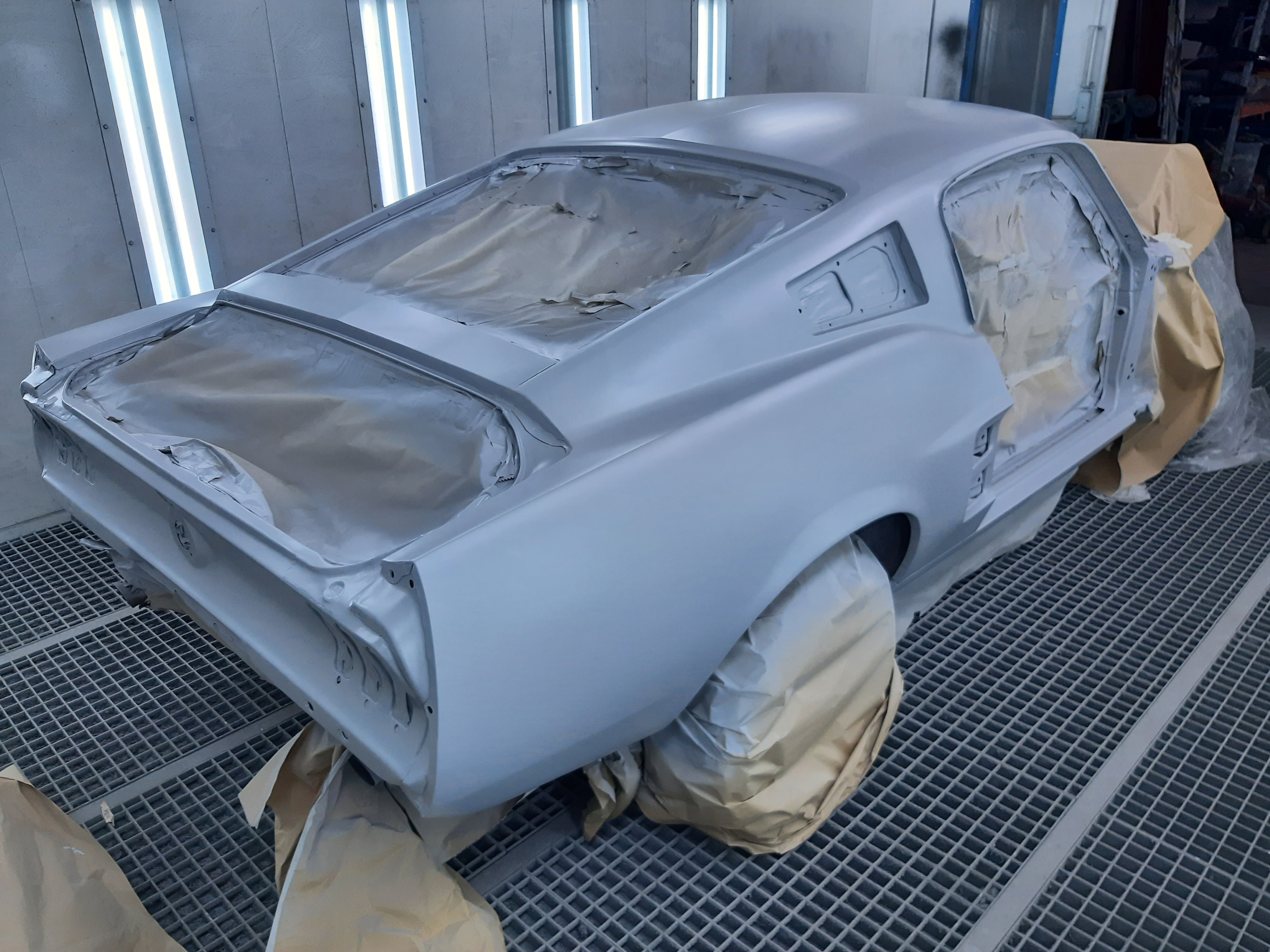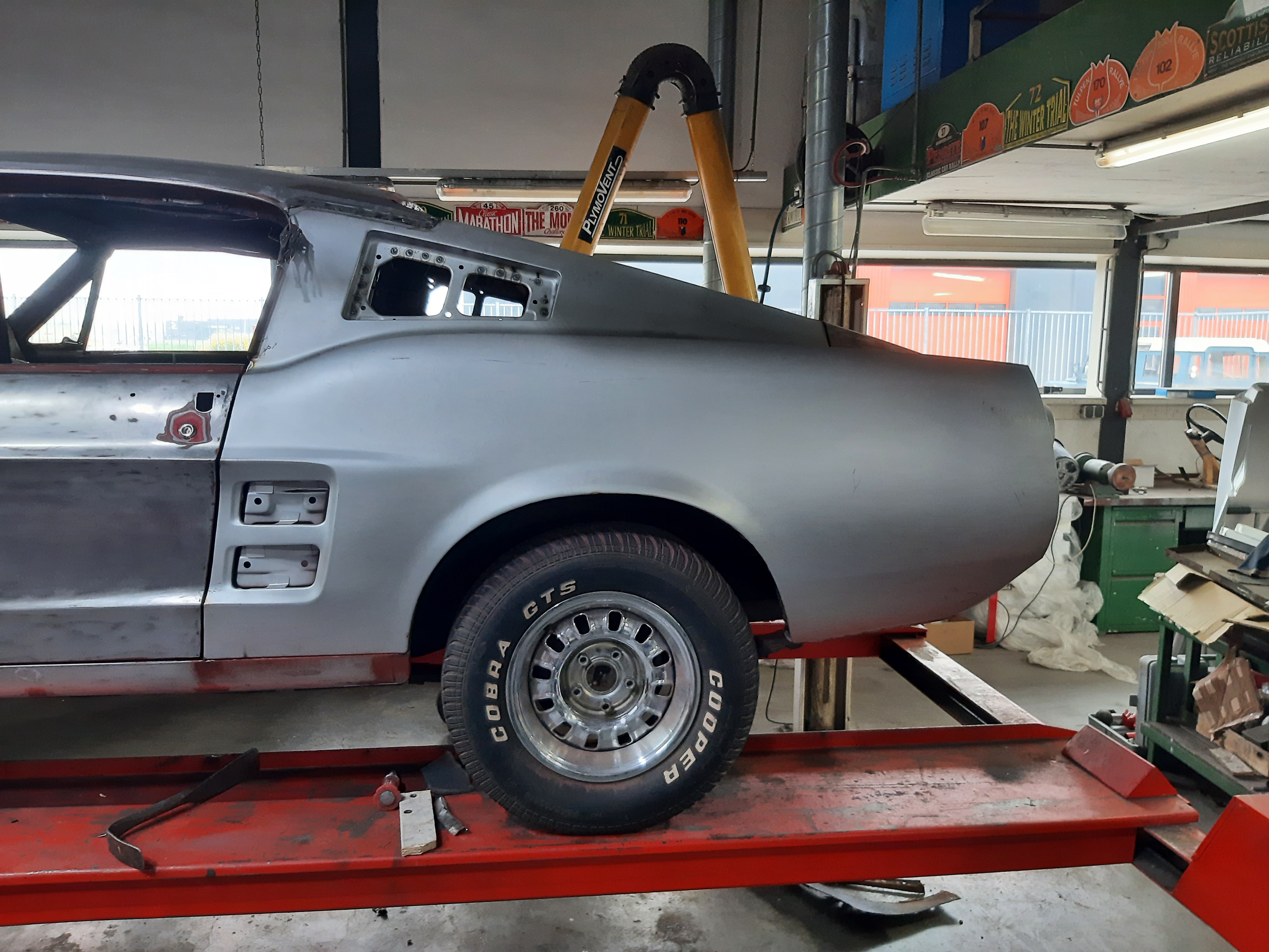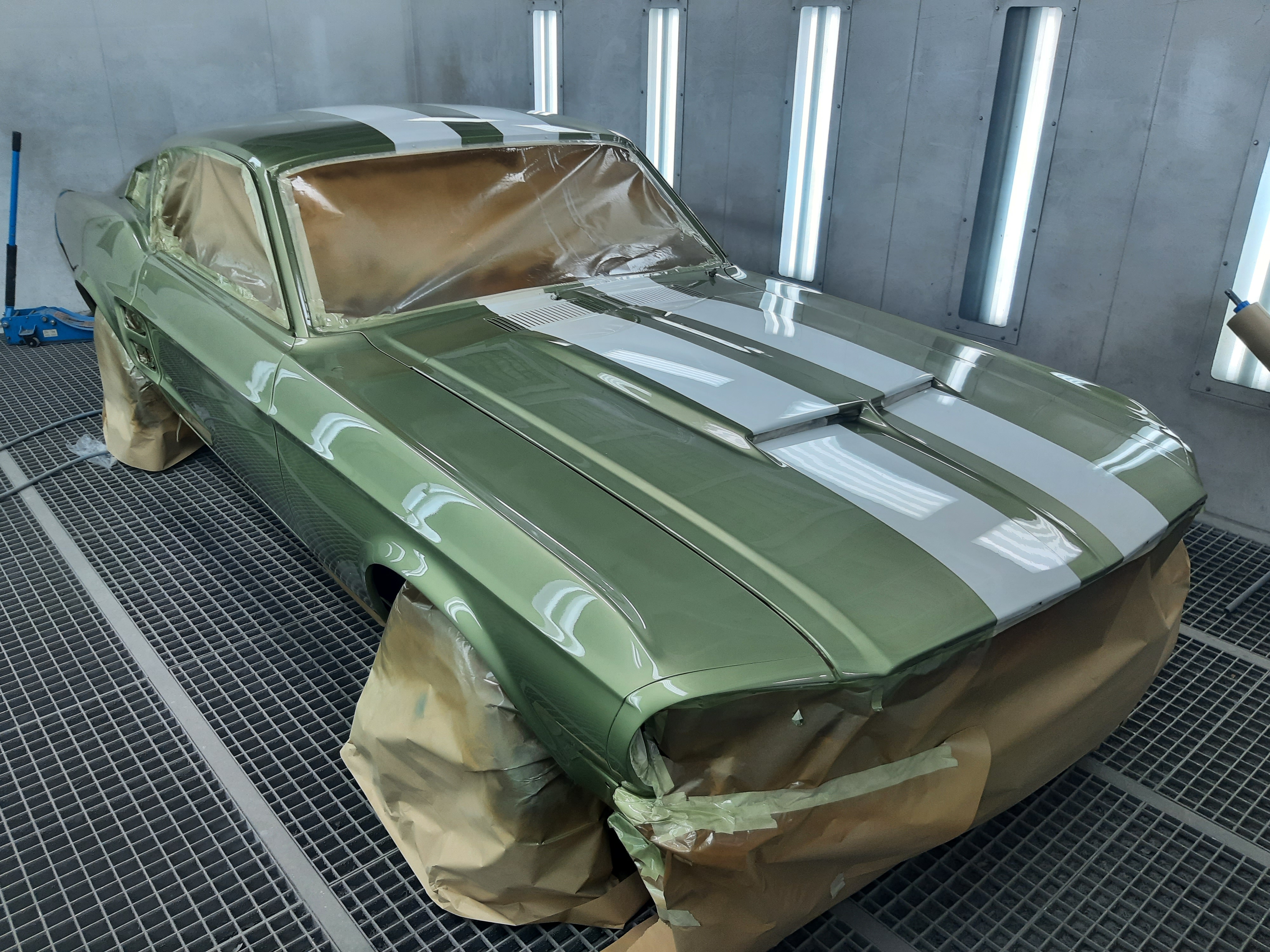 Nadat het zware laswerk en de reconstructie van de panelen voltooid waren, hebben wij het plaatwerk tot in de puntjes strak gemaakt om de Mustang voor te bereiden op het spuitproces. Het eindresultaat is een technisch gezonde, kaarsrechte Fastback in een klassieke groene kleur—klaar om weer de weg op te gaan.